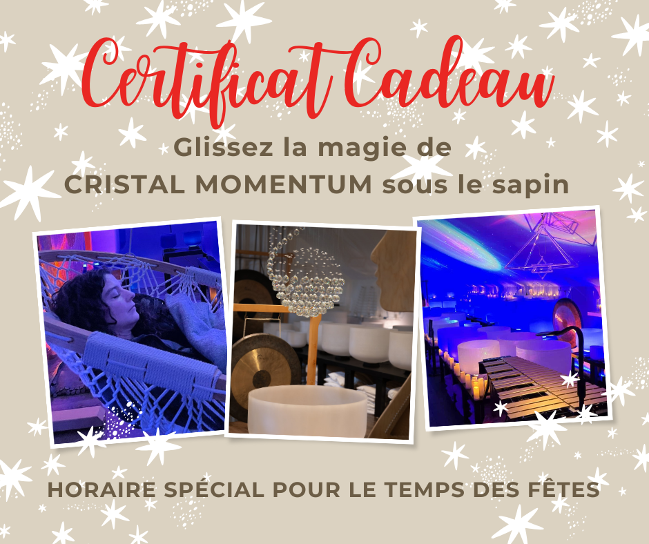 CRISTAL MOMENTUM vous offre des expériences sonores grâce à une gamme d’instruments spécifiquement sélectionnés pour leur son musical afin de créer une structure mélodique axée sur les vibrations produites par les sons.